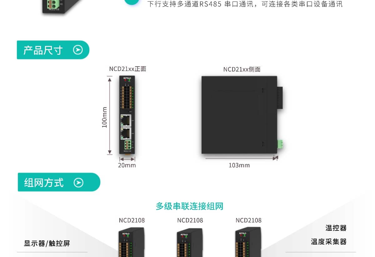 | 2 | Modbus工业网关 | NCD2108 | 双100M以太网接口,支持交换功能,下行8路RS485接口,导轨安装。 |