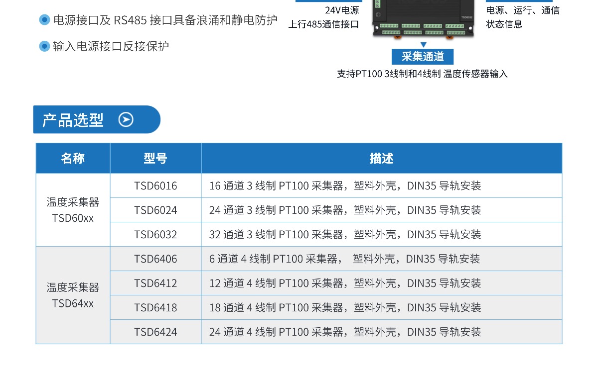 TSD60xx/TSD60xx-U 是一款多通道的温度采集器。设备可提供 16 路、24 路或 32 路温度采集通道,支持 PT100 型传感器接入。支持 1 路上行 RS485 通讯串口,使用标准 Modbus RTU 协议通讯,支持最大 8 台设备 485 总线使用。