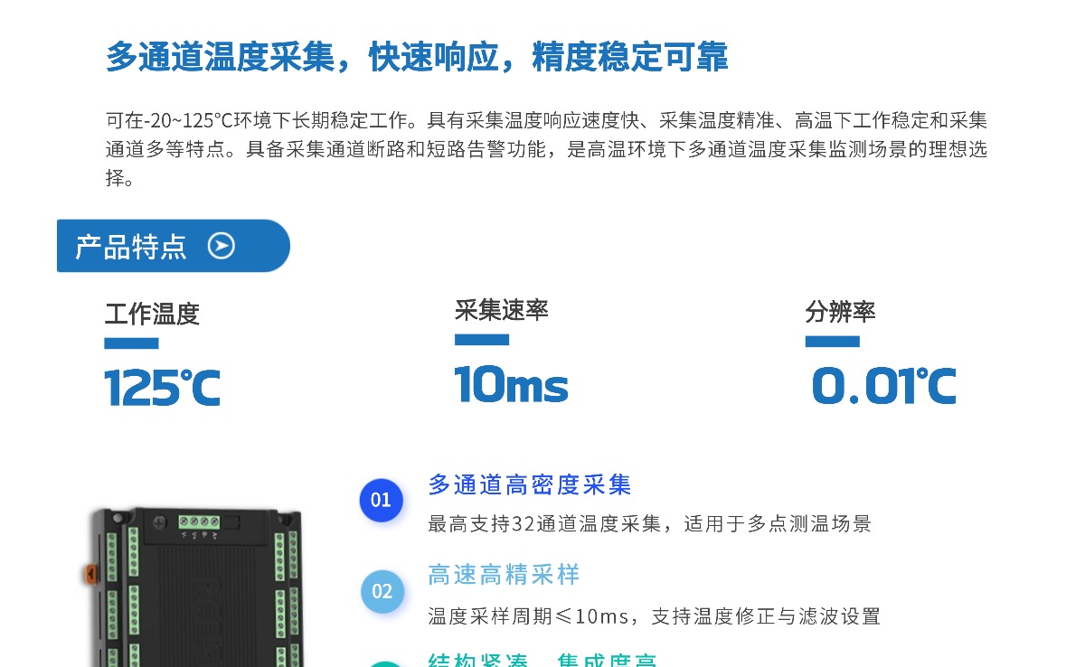 可在-20~125℃环境下长期稳定工作。具有采集温度响应速度快、采集温度精准、高温下工作稳定和采集通道多等特点。具备采集通道断路和短路告警功能,是高温环境下多通道温度采集监测场景的理想选择。