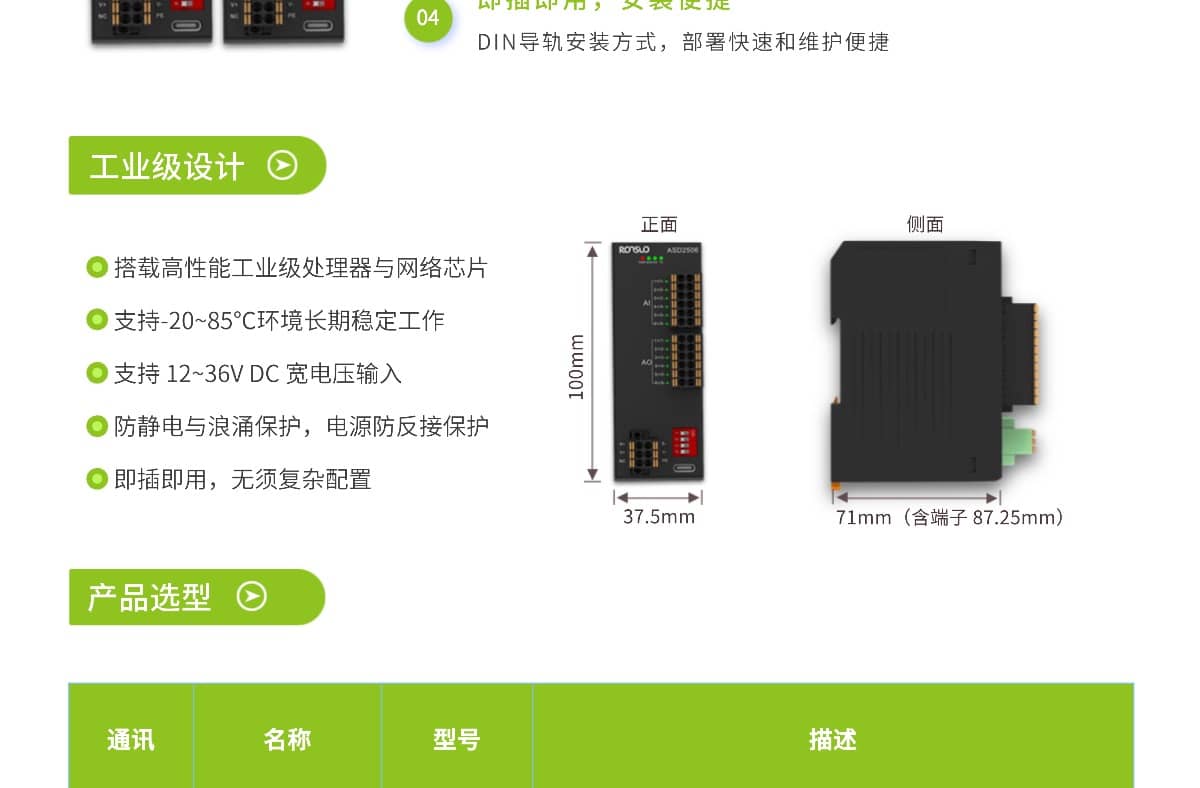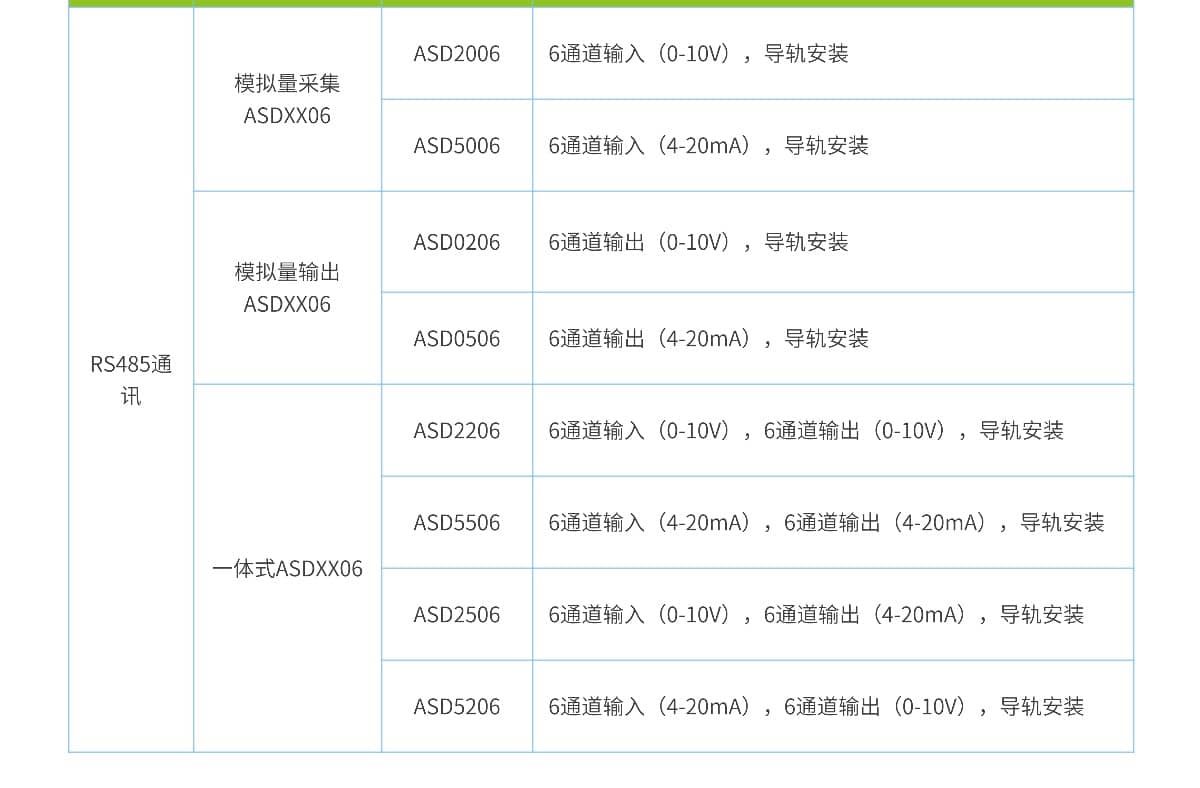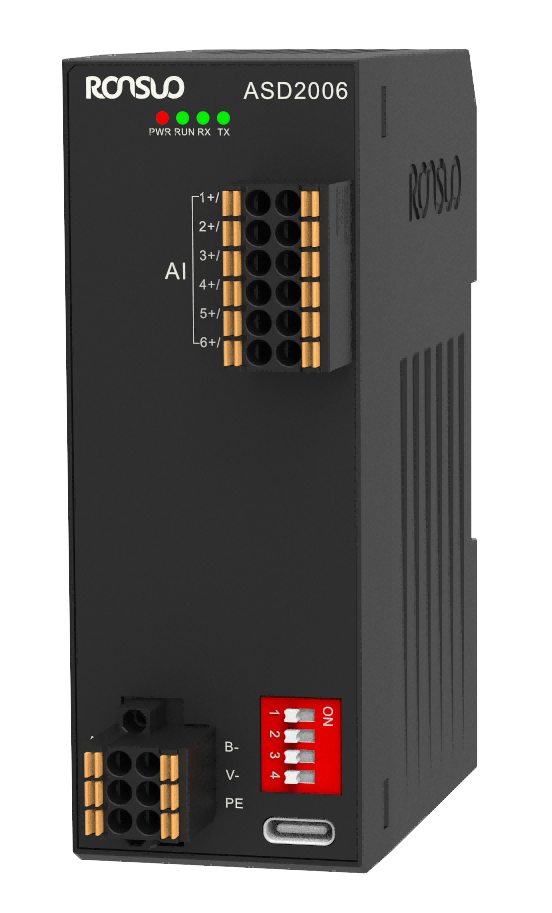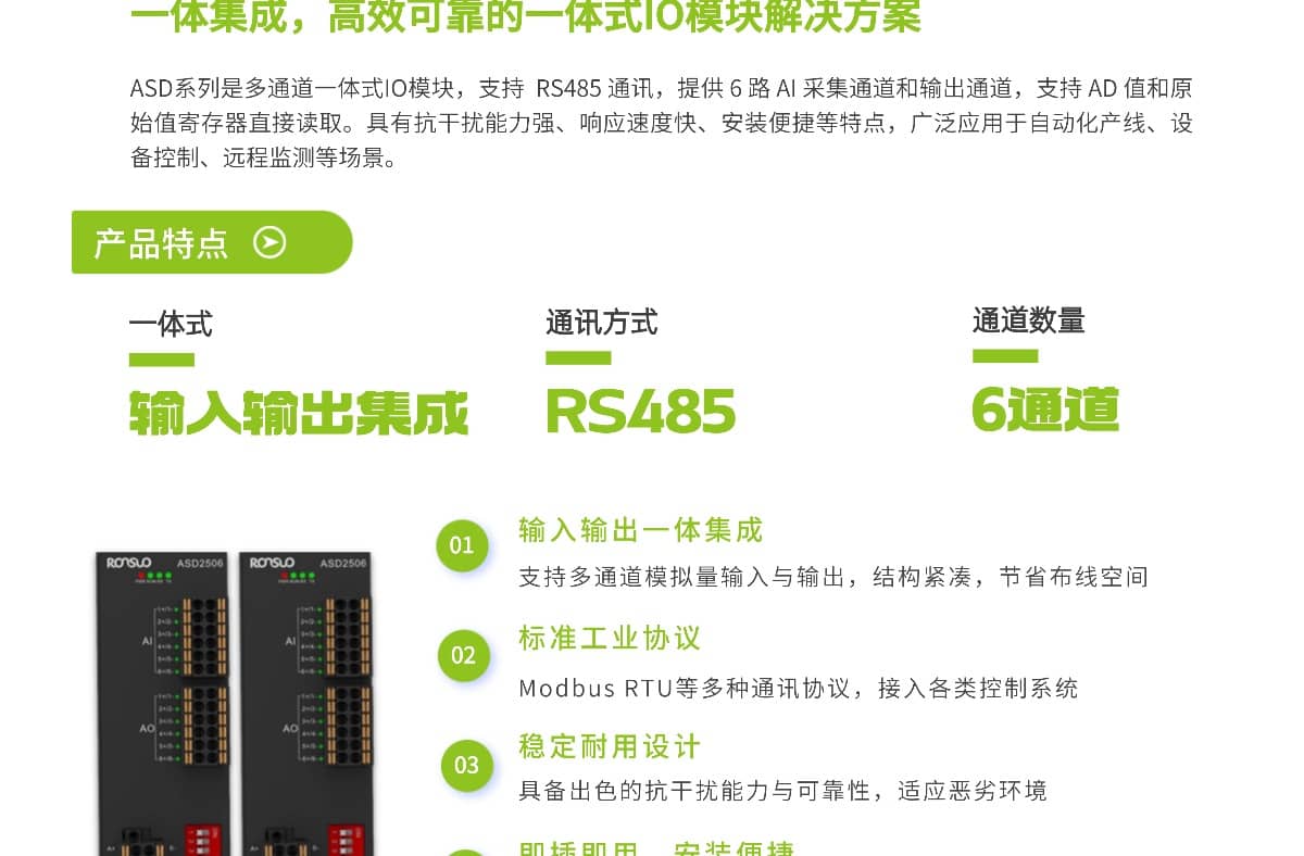 ASD系列是多通道一体式IO模块,支持 RS485 通讯,提供 6 路 AI 采集通道和输出通道,支持 AD 值和原始值寄存器直接读取。具有抗干扰能力强、响应速度快、安装便捷等特点,广泛应用于自动化产线、设备控制、远程监测等场景。