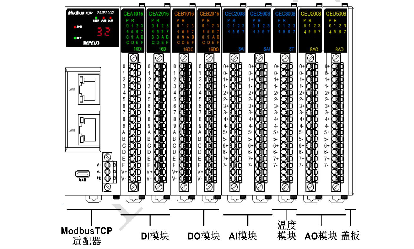 | 1 | 适配器 | 适配器模块 | GMB2032 | Modbus TCP适配器,最大支持32个扩展模块 |