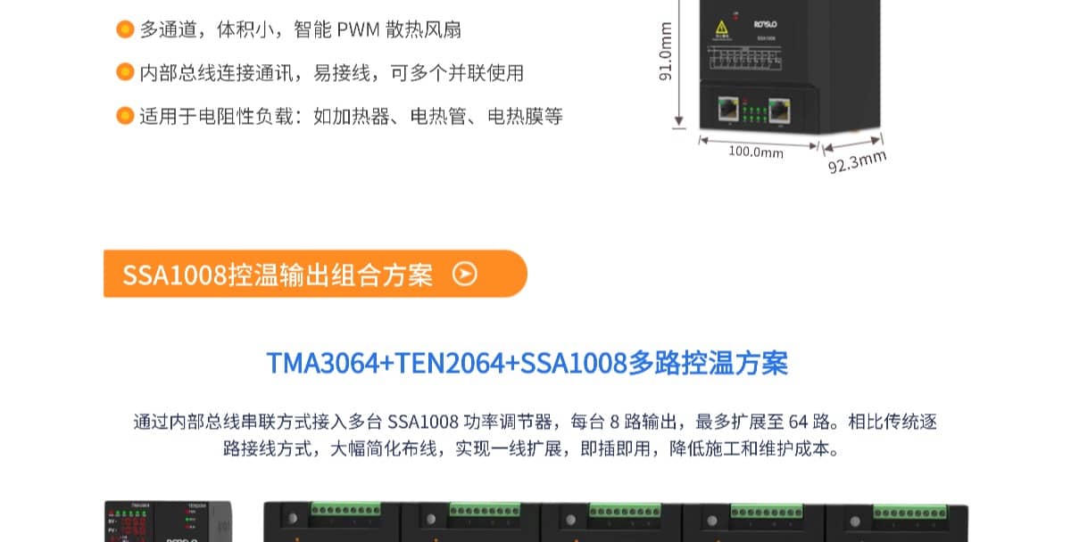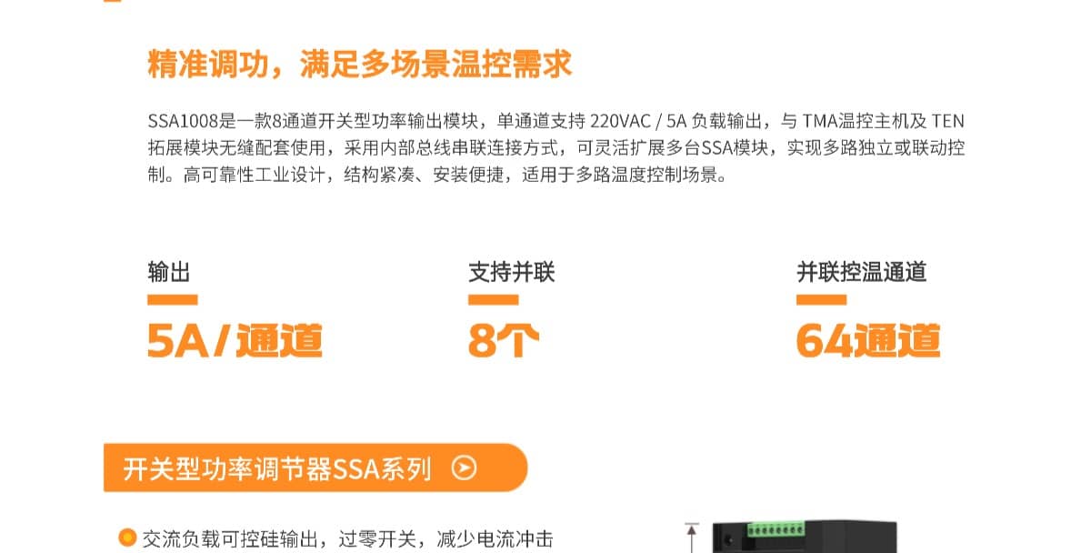 SSA1008是一款8通道开关型功率输出模块,单通道支持 220VAC / 5A 负载输出,与 TMA温控主机及 TEN拓展模块无缝配套使用,采用内部总线串联连接方式,可灵活扩展多台SSA模块,实现多路独立或联动控制。高可靠性工业设计,结构紧凑、安装便捷,适用于多路温度控制场景。