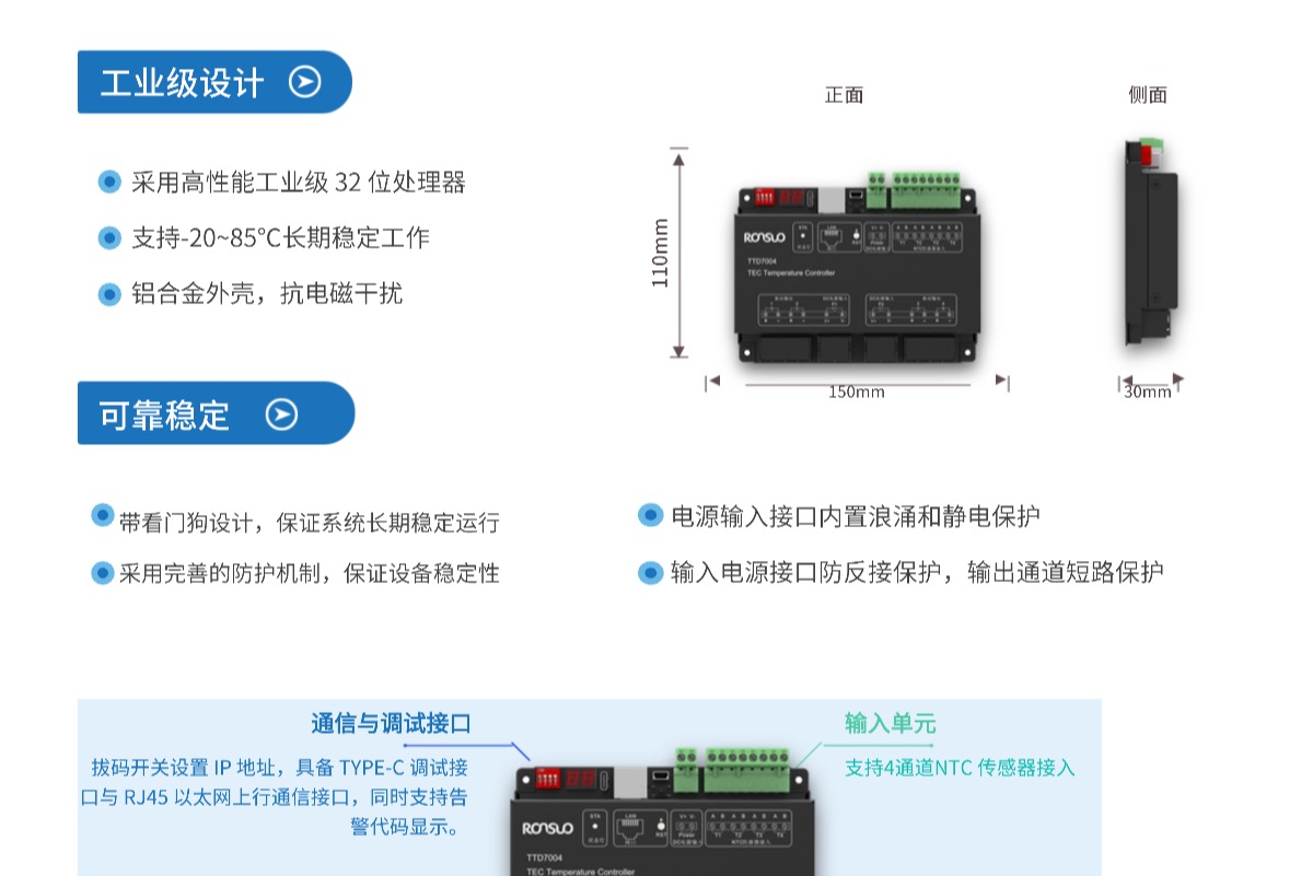 TTD70xx是一款网络型2/4/8路TEC温控器,支持1/2/4/8路NTC型热敏电阻温度传感器接入,支持2/4/8路制冷制热输出,输出额定电流高达10-15A,输出分为2组,每组均支持4-30V输入,方便驱动不同功率和电压的TEC,提供一路上行以太网接口,支持标准ModbusTCP协议。