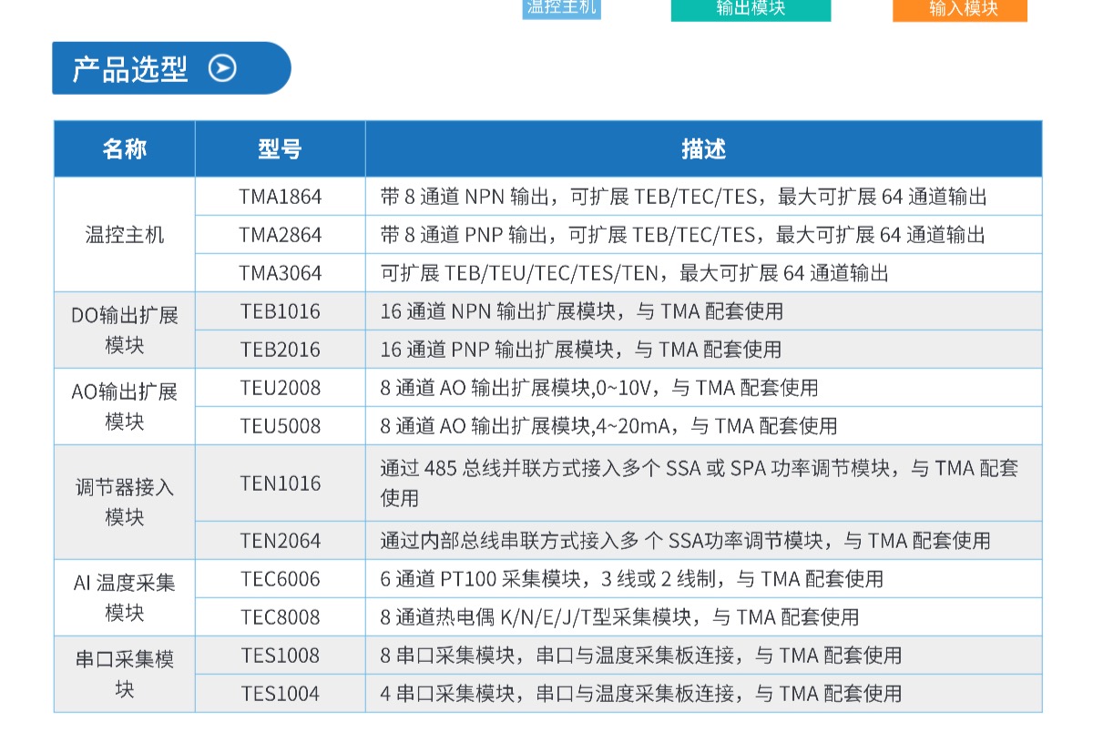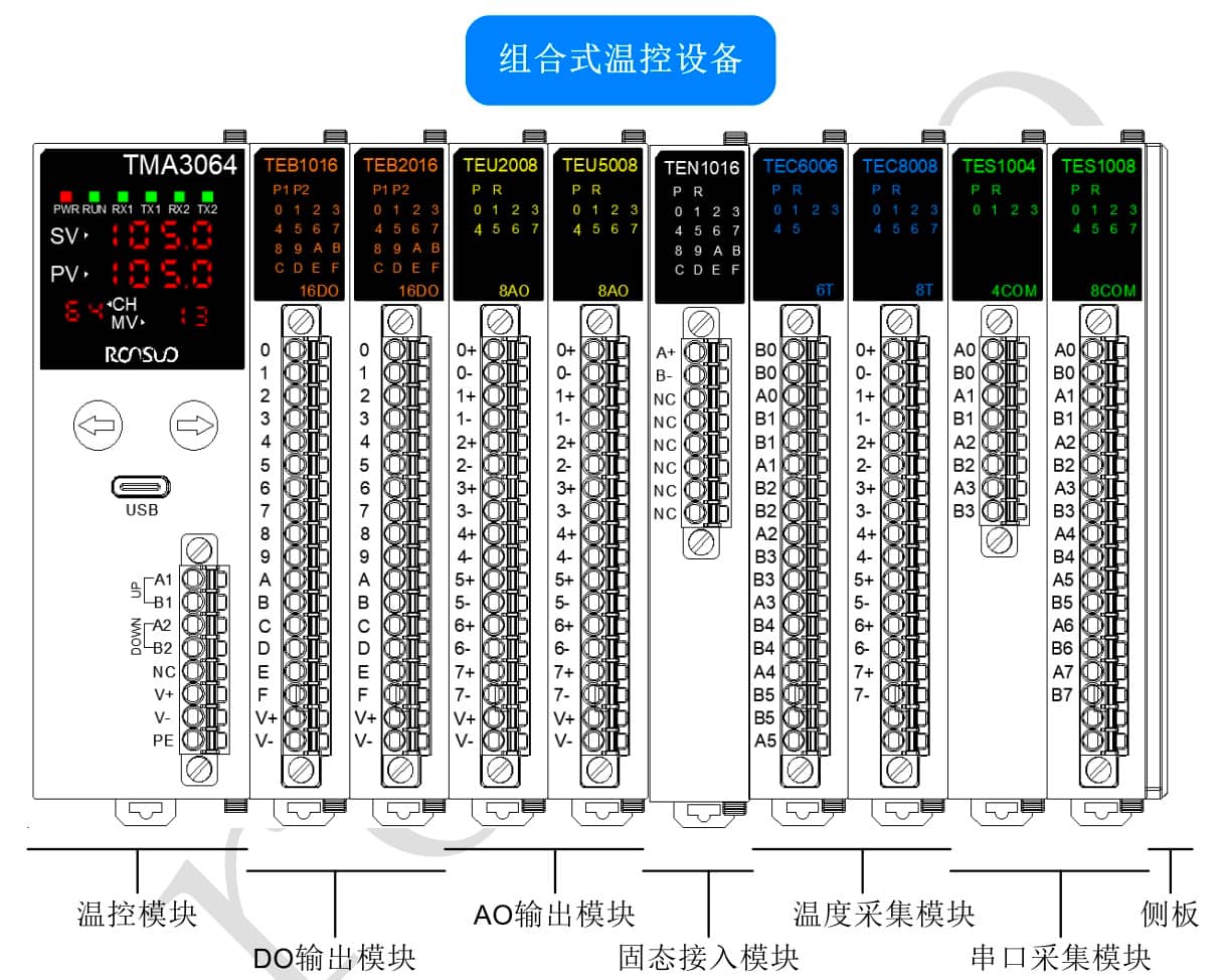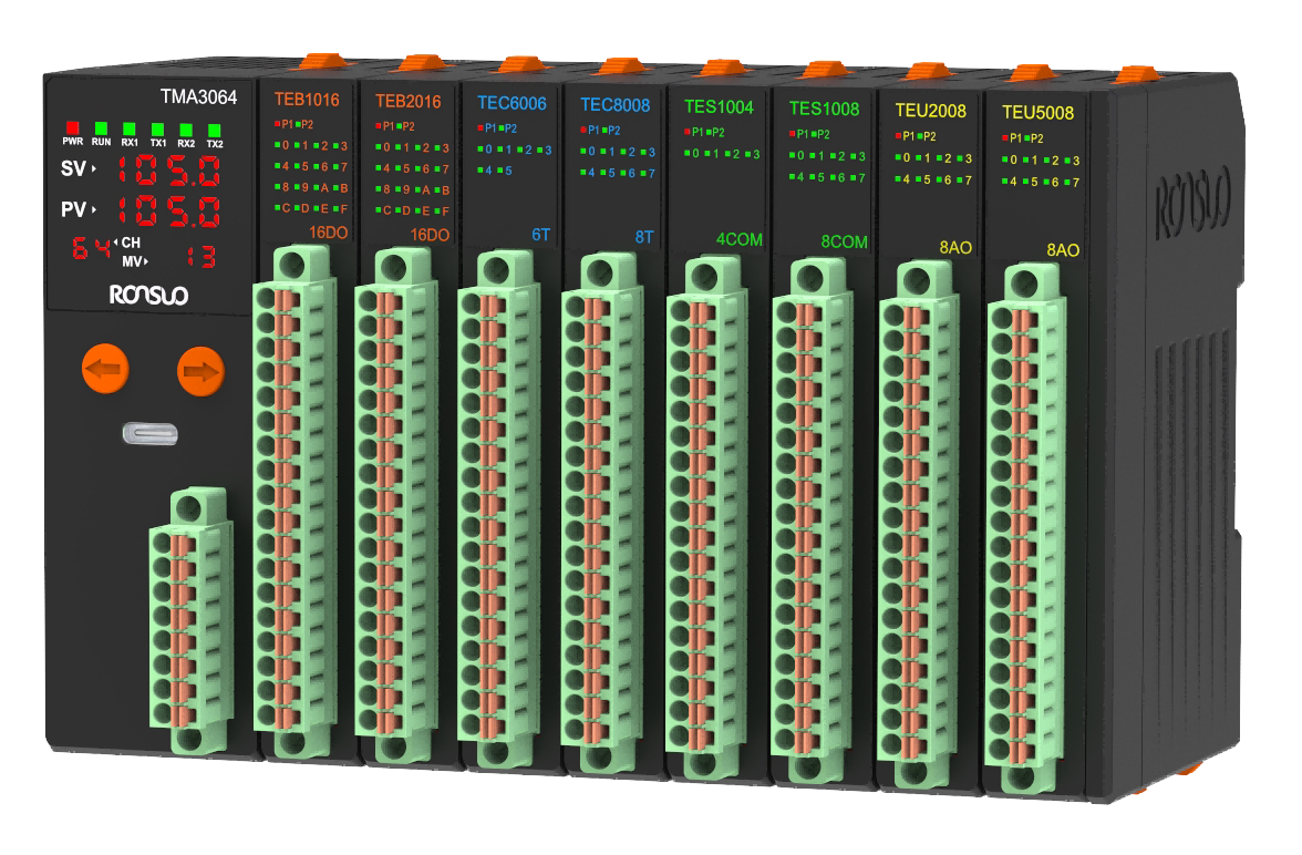 TMAx064是组合式温控模块的主控模块,提供2路RS485接口,可以实时显示温度设定SV值、温度PV值、输出比例MV值,支持拼接扩展采集模块和输出模块,最多支持扩展到64路控制输出,192路采集输入。