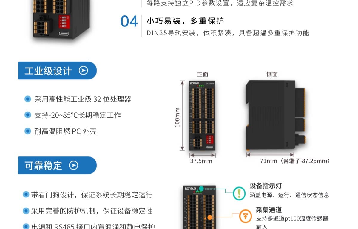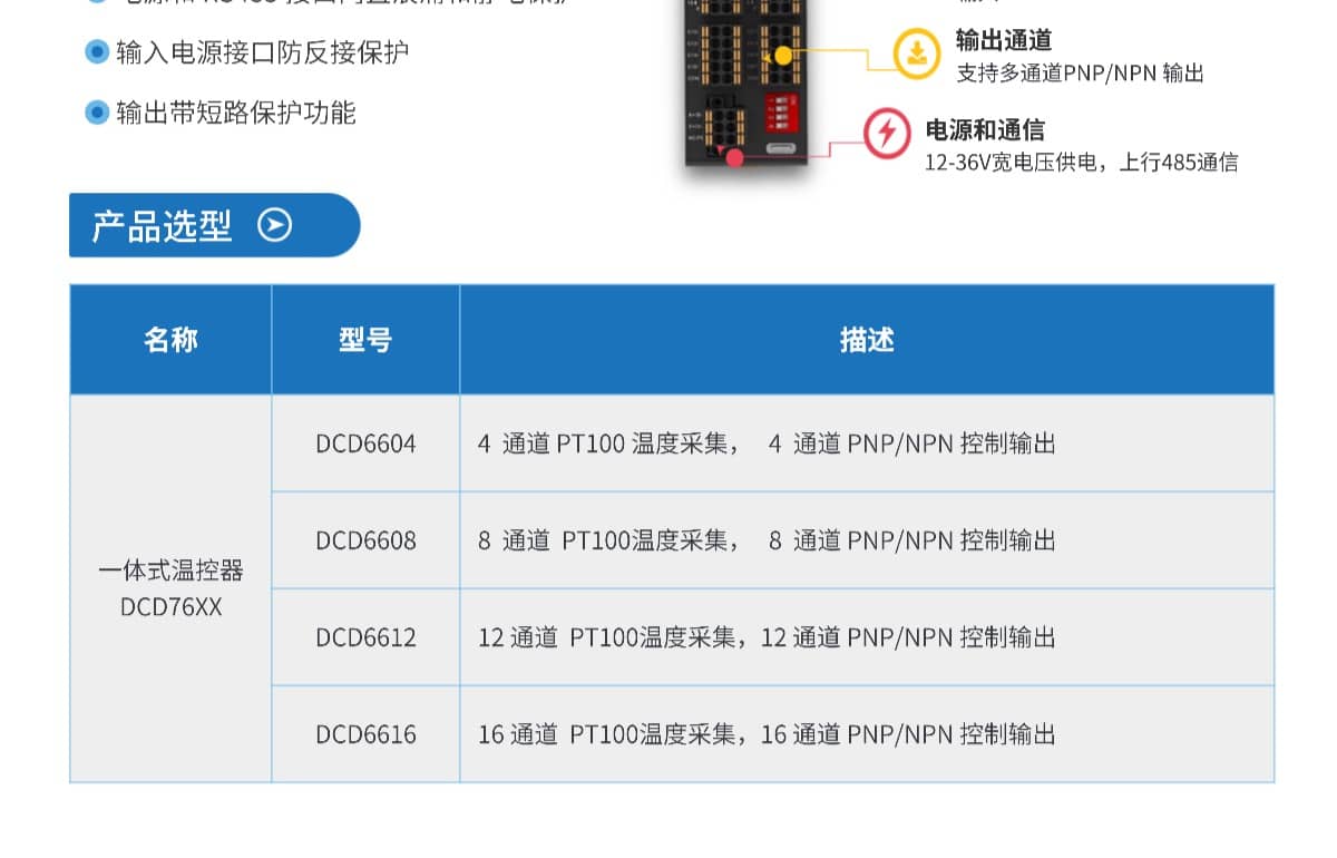 DCD66xx是一款集成了多路3线制PT100采集以及多路NPN/PNP控制输出的产品,产品提供一路上行RS485通信接口,支持标准ModbusRTU协议。