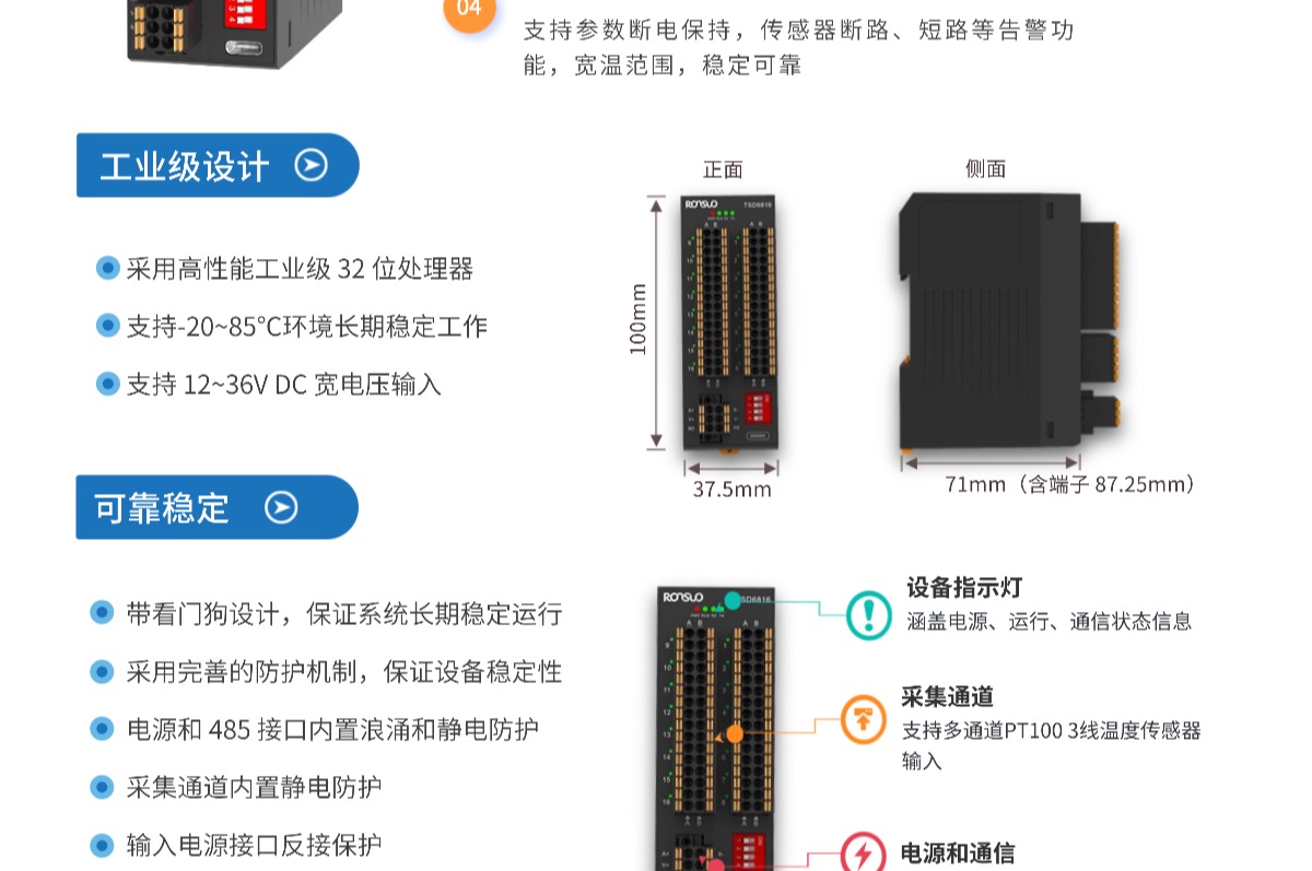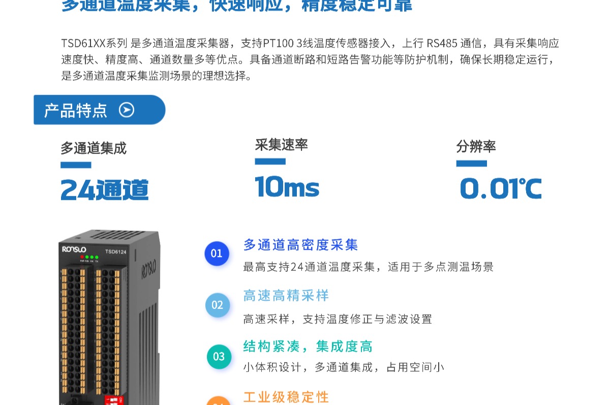 TSD61XX系列是多通道温度采集器,支持PT100 3线温度传感器接入,上行 RS485 通信,具有采集响应速度快、精度高、通道数量多等优点。具备通道断路和短路告警功能等防护机制,确保长期稳定运行,是多通道温度采集监测场景的理想选择。