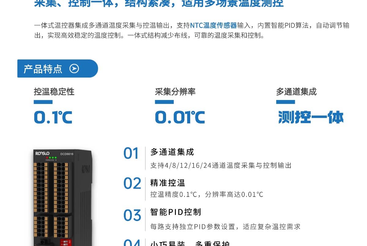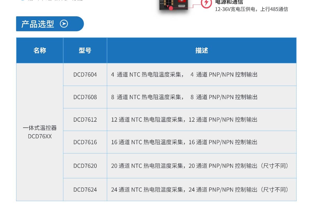 | 5 | 一体式温控器 | DCD7620 | 20路NTC热电阻温度采集,20路PNP/NPN控制输出,DIN35导轨或螺丝安装 |