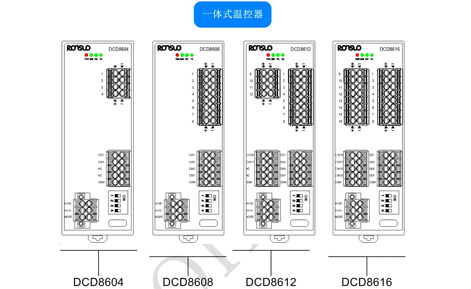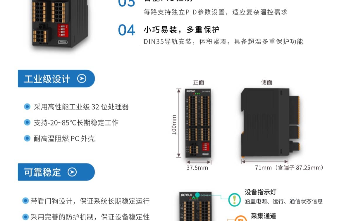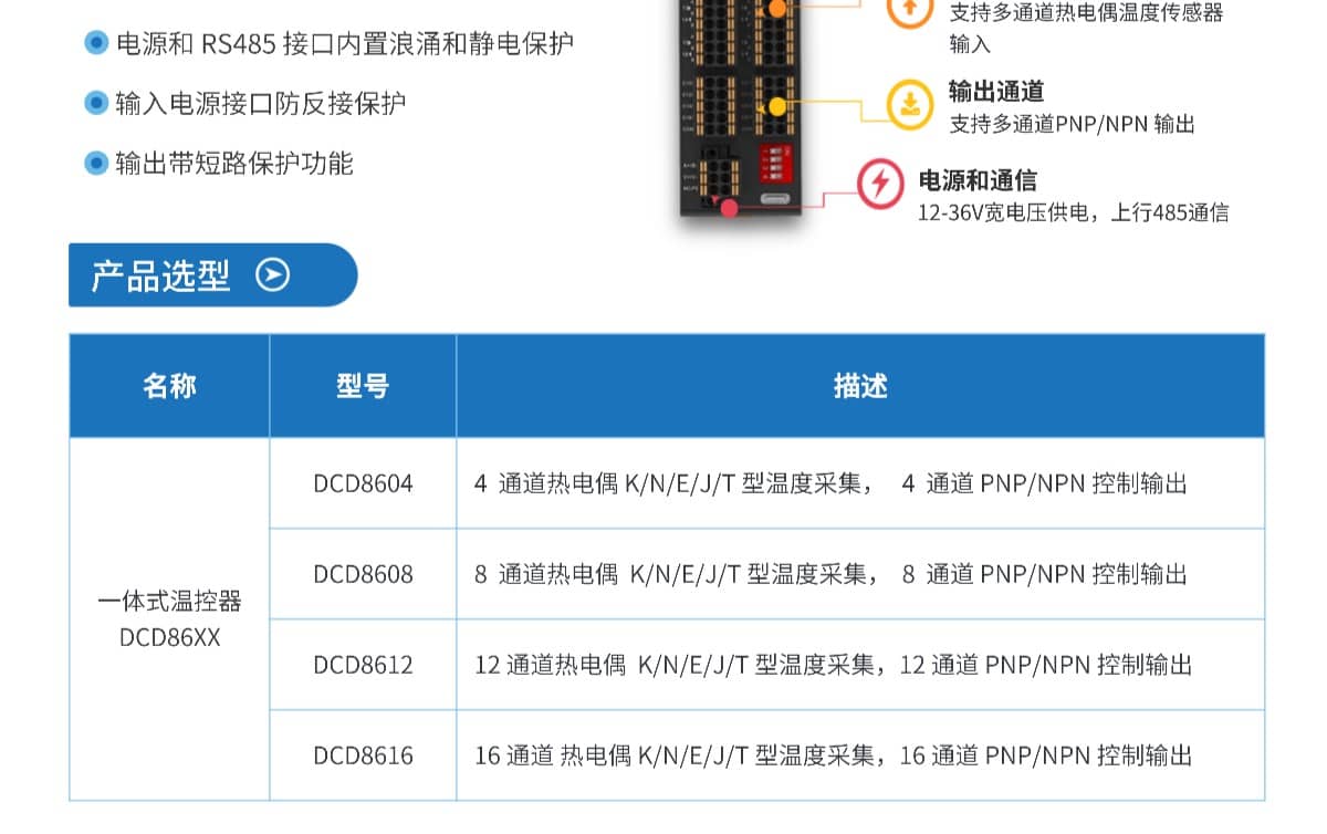 一体式温控器集成多通道温度采集与控温输出,支持热电偶温度传感器输入,内置智能PID算法,自动调节输出,实现高效稳定的温度控制。一体式结构减少布线,可靠的温度采集和控制。