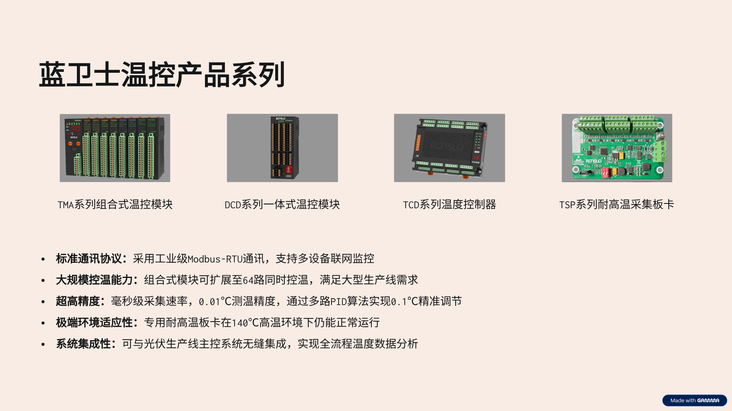 Blue Guardian temperature controllers are crucial in the photovoltaic module production process, involving silicon wafer manufacturing, cell production, packaging processes, and testing.