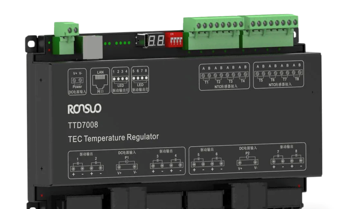 蓝卫士温控推出的 TTD7008 TEC 精密温控器,通过高精度温度采集与双向制冷/加热控制,实现从-55℃到200℃全过程的精准调控,确保每个测试工位温度一致、曲线可控、结果可追溯。