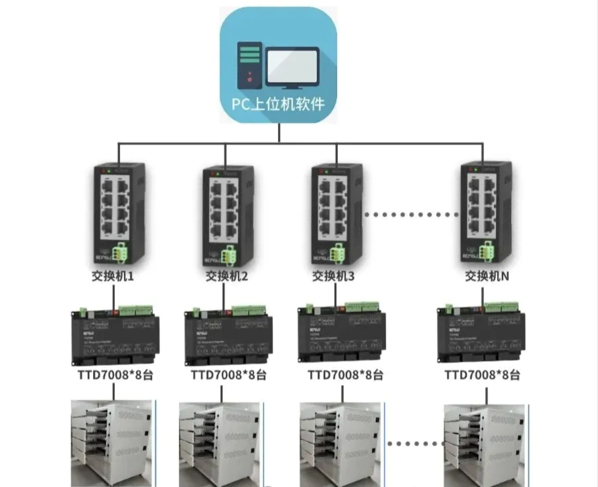 方案以蓝卫士温控 TTD7008 TEC 精密温控器 为核心,构建光学镜片老化测试的高精度温控系统。整线采用分布式网络架构,PC端统一管理320个测试位,实现从常温至80℃的自动升温、恒温与降温控制。系统控温精度达 ±0.1℃,支持多通道并行、曲线记录与异常监测,确保测试数据一致、可追溯,为光学镜片的性能验证与可靠性评估提供稳定高效的温控方案。